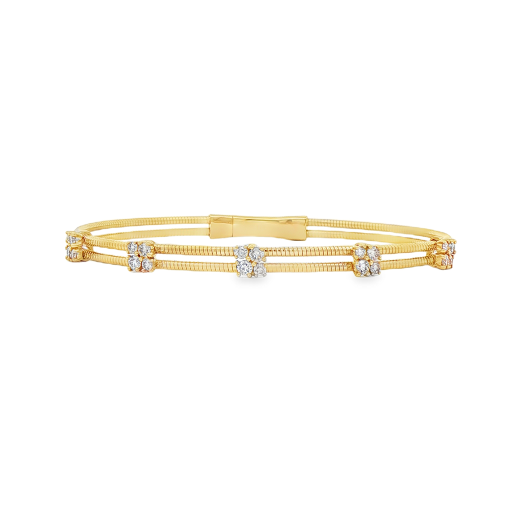 This elegant 14K yellow gold 5-Square Flexi bangle is set with 20 natural round brilliant cut diamonds totaling 0.70ctw. Weighing 7.4g, it features a flexible, comfortable fit and a sleek geometric design that blends modern sophistication with timeless sparkle—perfect for everyday wear or stacking with other bangles.