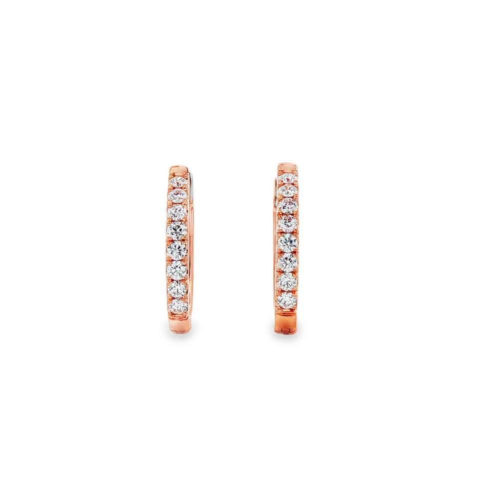 These classic 14K rose gold oval hoop earrings measure 18.5 x 2.5mm and are set with 16 natural round brilliant cut diamonds, each measuring 2.0mm, totaling 0.48 carats. Graded SI2 clarity with F color, the diamonds provide bright sparkle against the warm rose gold. Weighing 4.5 grams, these hoops offer timeless elegance with a refined touch of brilliance.
