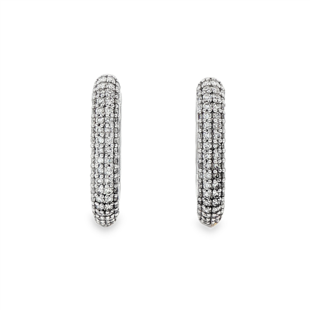 These 14K white gold square/oval hoop earrings measure 16.5x3.2mm and are set with 164 natural round brilliant cut diamonds totaling 0.59ctw. Weighing 4 grams, they offer a striking sparkle in a modern yet timeless design, perfect for both everyday wear and special occasions.