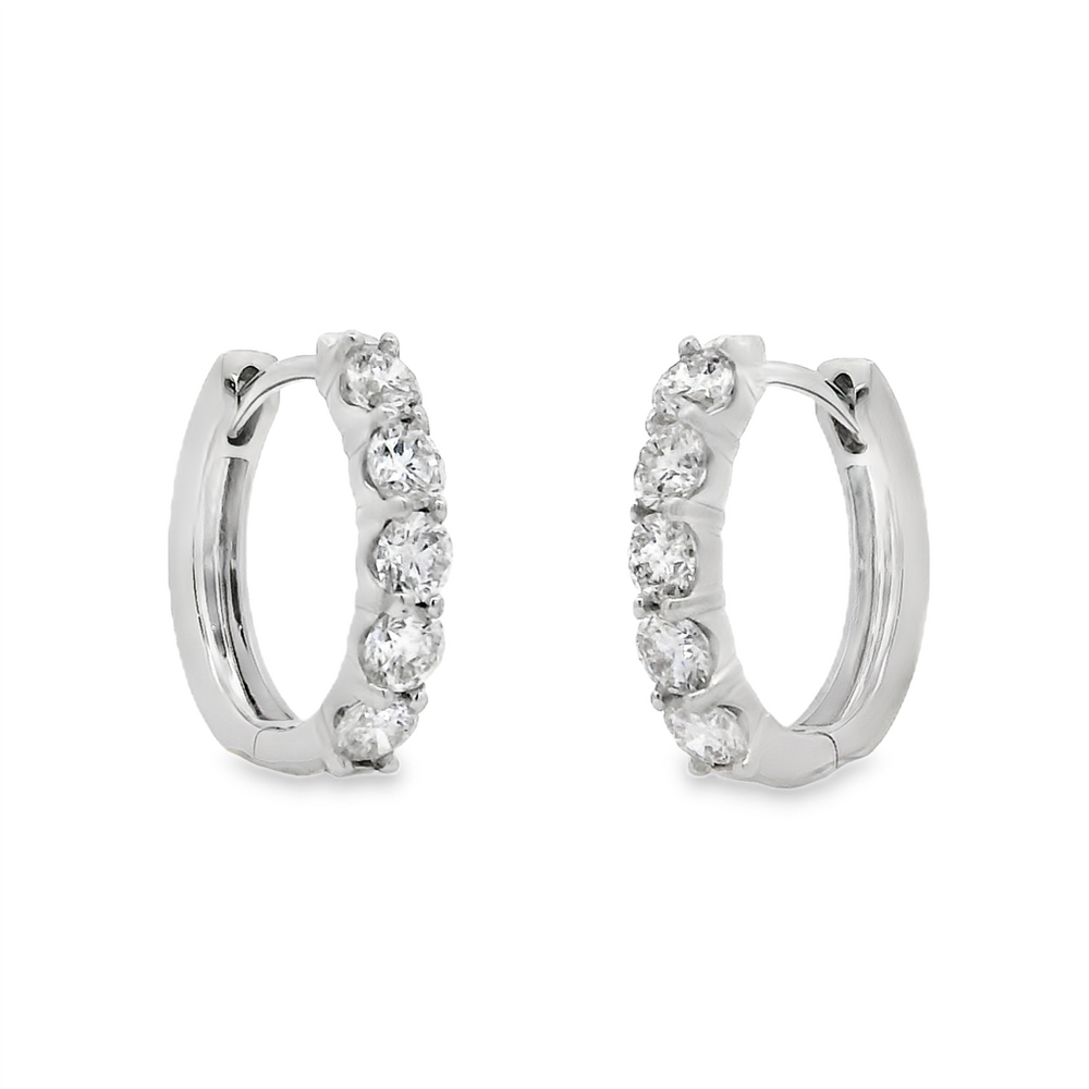 These 14K white gold oval hoop earrings measure 16x3.1mm and are set with 10 natural round brilliant cut diamonds totaling 1.25ctw. Weighing 3.7 grams, they offer refined sparkle in a timeless design, perfect for everyday wear or special occasions.