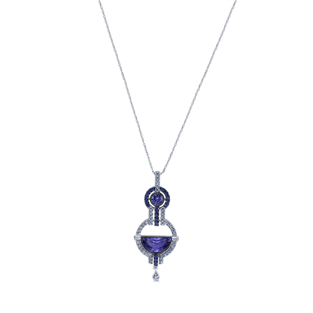 This one-of-a-kind pendant, designed by our very own Jasmine D., is an exquisite piece crafted in 18K white gold. It features a stunning 3.47ct half-moon shaped Tanzanite in a rich violet-blue hue, the centerpiece of this masterpiece. The pendant is further adorned with 0.59cts of pave set diamonds (GH VS), fine blue sapphires weighing 0.37ctw, and a 0.70ct round Tanzanite, creating a striking combination of colors and brilliance. This exceptional design blends the beauty of Tanzanite and sapphires with the elegance of diamonds, making it a true statement piece that showcases both craftsmanship and artistry.