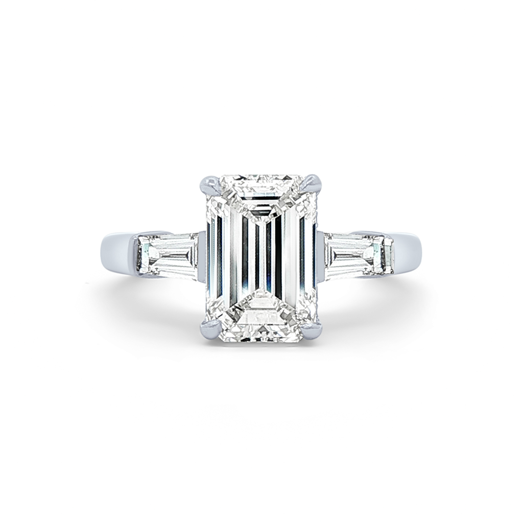 This elegant 18K white gold three-stone semi-mount engagement ring features a classic design accented with natural diamonds totaling 0.33 carats. The ring is set with 2 natural baguette diamonds weighing a combined 0.06ctw, complemented by Hearts & Arrows round brilliant cut diamonds for added sparkle and symmetry. Designed to beautifully enhance your chosen center stone, this setting offers timeless sophistication.