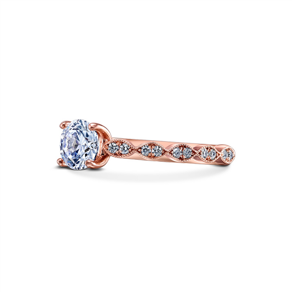 This 14K rose gold engagement ring semi-mount features ten marquise-shaped motifs on the shoulders, each set with two small round brilliant cut diamonds, graded VS clarity and GH color, for a total of 0.16cts. The center stone (sold separately) is a 0.60ct round brilliant cut, perfectly complementing this elegant design.