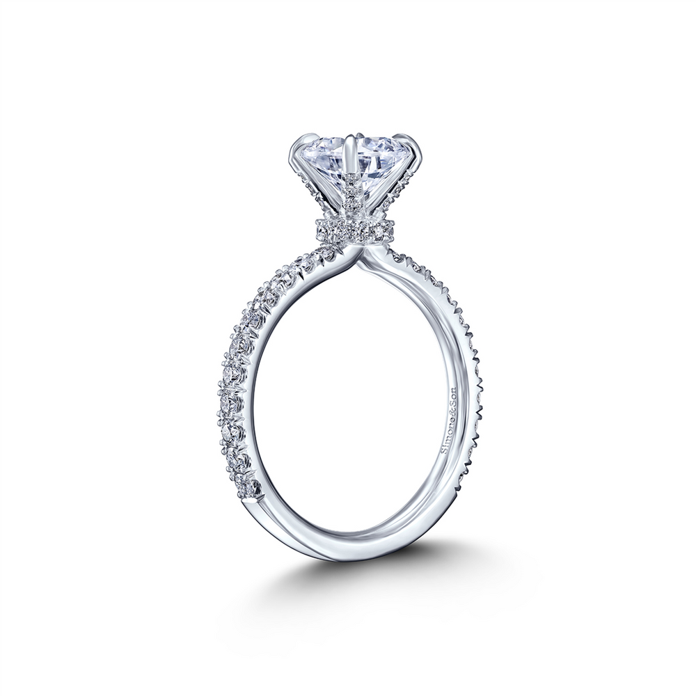 This classic18K white gold semi-mount engagement ring features a distinctive hidden halo that acts as a collar, beautifully accentuating the center stone. The unique prong design adds an innovative touch, setting this ring apart from others. The setting is adorned with 0.52ctw of ideal-cut Hearts & Arrows diamonds, showcasing GH color and VS clarity for exceptional brilliance. The ring is designed to accommodate a 1.25ct round center stone (sold separately), offering a sophisticated and timeless look.