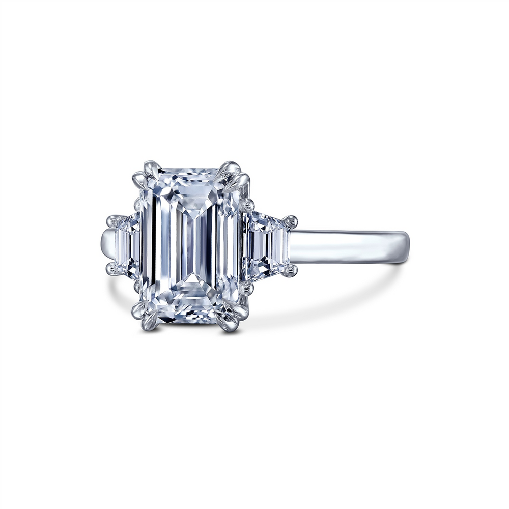 This elegant 14K white gold 3-stone semi-mount engagement ring features lab-grown step-cut trapezoid diamonds totaling 0.60ctw, adding brilliance and sophistication to the design. The ring is designed to showcase a 2.91ct lab-grown emerald cut diamond (center stone sold separately), with D color and VS1 clarity, certified by IGI (Report #631105563). Sized at 6.5, this timeless ring offers a refined and classic style, perfect for highlighting a stunning center stone.