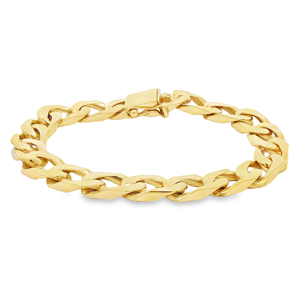 This 14K yellow gold estate oval link bracelet features bold 10 x 18 x 3mm links that create a strong, eye-catching silhouette with timeless appeal. Measuring 8.5 inches in length and weighing an impressive 53.9 grams, it offers a substantial, luxurious feel with a polished finish that reflects light in rich golden flashes. The elongated oval links provide both durability and fluid movement, making this bracelet a powerful statement piece worn on its own or paired with other fine jewelry. Distinctive, elegant, and full of character, this estate bracelet is a standout addition to any fine jewelry collection.