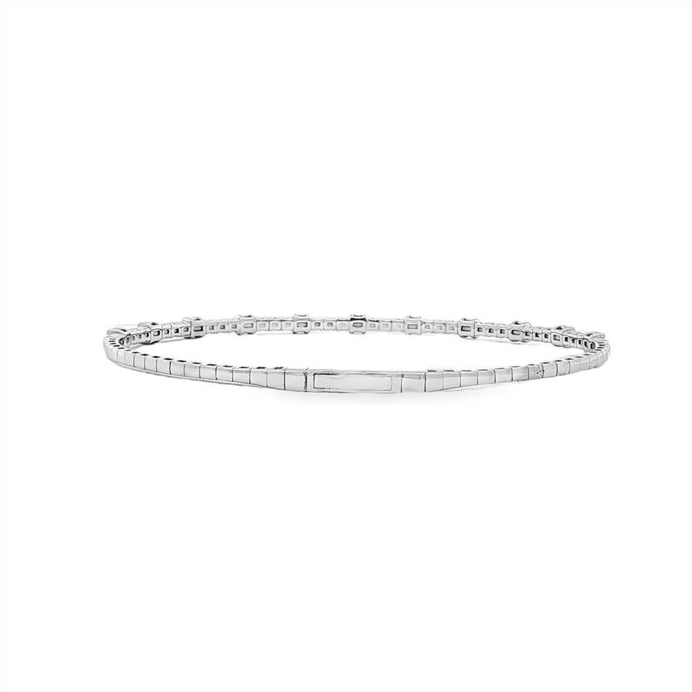 This 14K white gold flexi bracelet weighs 5.4 grams and features a 2.9mm design set with 45 sparkling diamonds totaling 1.00ctw. The two-size half-diamond pattern creates a distinctive look, while the flexi design ensures comfort and effortless wear.