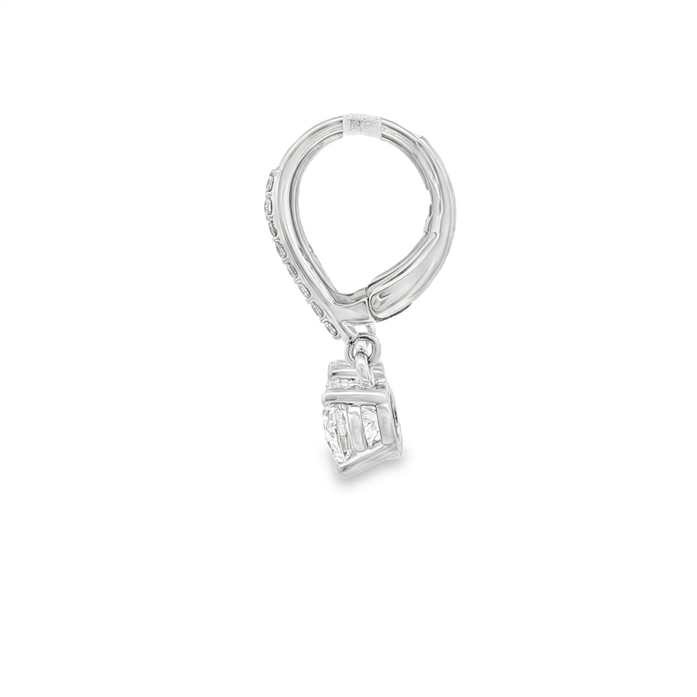 These 14K white gold dangle earrings showcase two stunning lab-grown round diamonds totaling 2.10ctw, graded D color and VVS2 clarity with IGI certification. Accented by 16 smaller lab-grown round diamonds totaling 0.20ctw, the earrings feature a combined diamond weight of 2.30ctw. With a total weight of 3.3 grams, this elegant design offers exceptional sparkle and sophistication for any occasion.