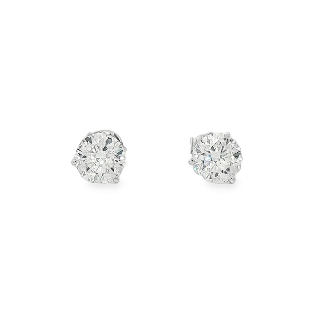 Set with two lab grown round brilliant cut diamonds totaling 2.10 carats, these elegant studs are crafted in 14K white gold. Graded D color and VVS2 clarity, the diamonds offer exceptional brilliance and near-flawless clarity. Secured in classic three-prong martini settings with standard friction backs.