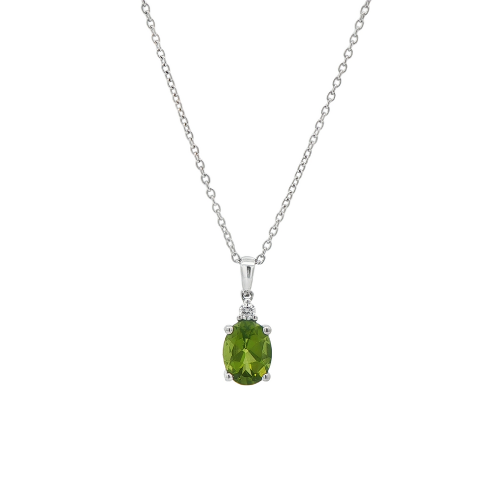 This 14K white gold pendant features an oval peridot, measuring 8x6mm, accented with a sparkling diamond totaling 0.04 carats. Weighing 0.6 grams and measuring 14.5 x 6mm, this piece makes a vibrant and elegant birthstone pendant for August.
