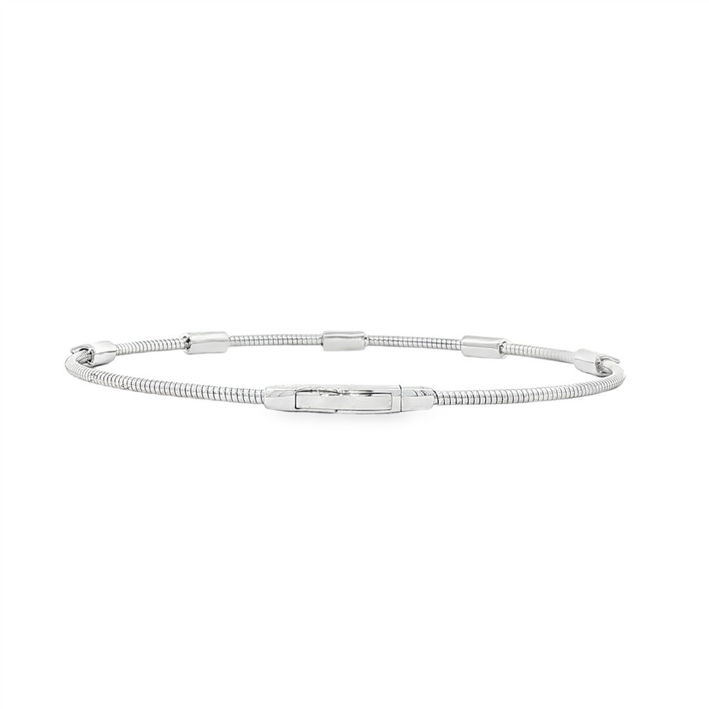 This 14K white gold flexible bracelet features an elegant twist bar design, set with 15 natural diamonds totaling approximately 0.22 carats. Measuring 2.7mm wide and weighing 4.6 grams, it offers a refined sparkle with a modern, versatile look.