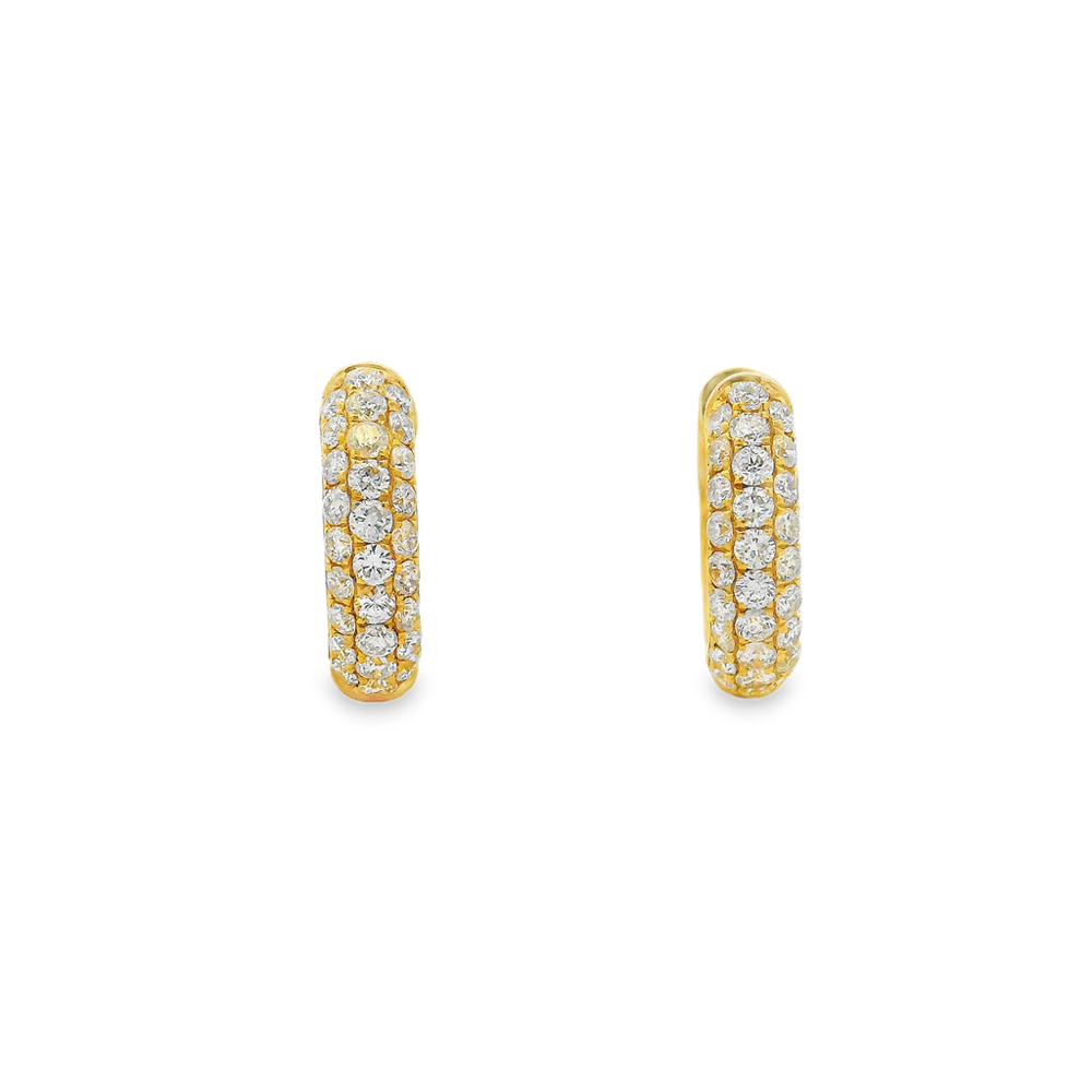 These 14K yellow gold hoop earrings measure 16x4.1mm and are set with 56 natural round brilliant cut diamonds totaling 1.09ctw. Weighing 4.1 grams, they combine bold sparkle with a timeless design, making them perfect for everyday wear or special occasions.