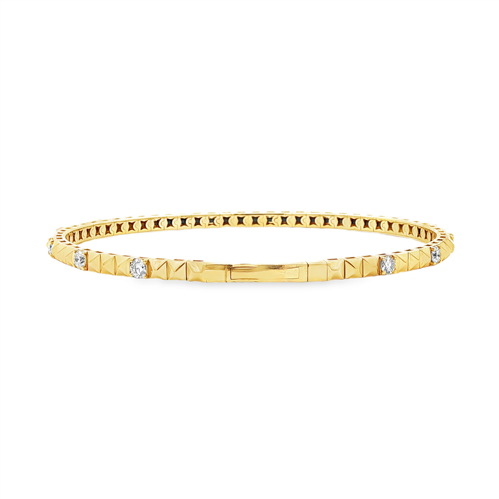14kt yellow gold flexible bangle, 2.7mm wide, weighing 10 grams, featuring 14 sparkling diamonds totaling 1.05 carats in a 3-studded design. The flexi construction ensures a comfortable fit, while the diamonds add timeless elegance—perfect for layering or wearing alone.
