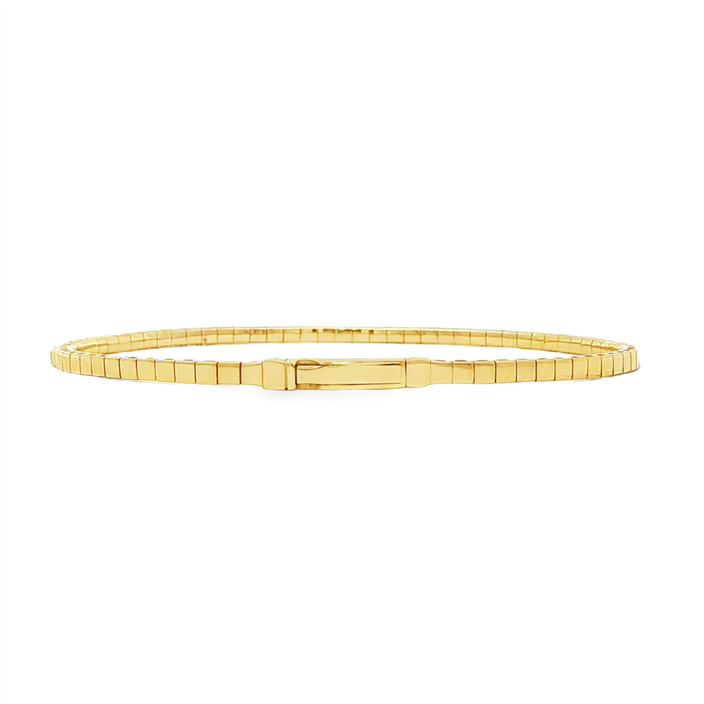 This 14K yellow gold flexi bracelet weighs 5.8 grams and is set with a 0.64ct ruby and natural diamonds totaling 0.48ctw. The vibrant red ruby paired with sparkling diamonds creates a striking contrast, while the 2.1mm flexible design ensures comfort and ease of wear.