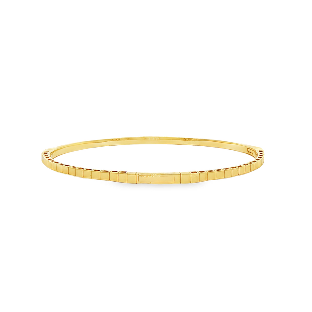 14kt yellow gold flexible bangle, 2.4mm wide, weighing 7.3 grams, set with 39 sparkling diamonds totaling 0.90 carats in a geometric design. The flexi construction ensures a comfortable fit, while the structured diamond pattern adds modern elegance—perfect for layering or wearing alone.
