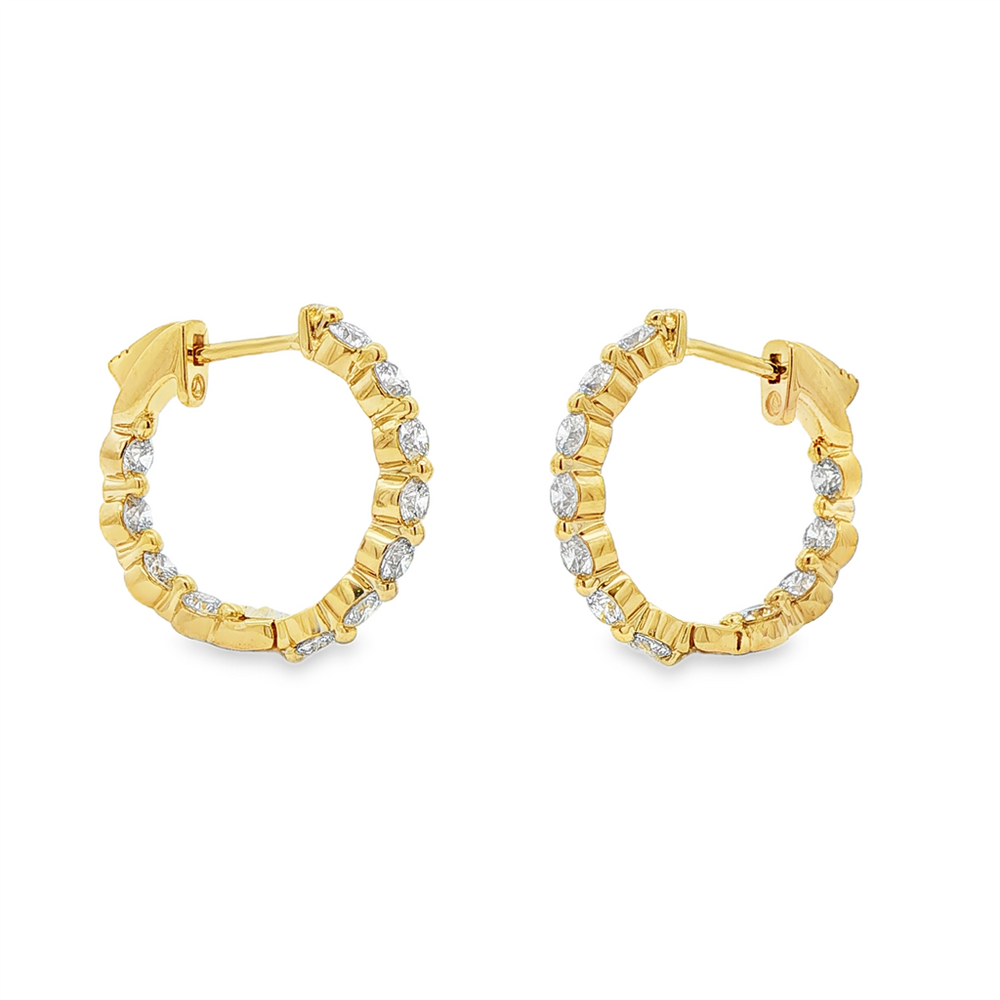 These 14K yellow gold inside-out hoop earrings feature 22 lab-grown round diamonds totaling 1.97ctw, graded VS clarity and EF color. Measuring 20x3mm and weighing 4.8g, they deliver brilliance from every angle. A luxurious yet versatile design, perfect for both everyday wear and elegant occasions.