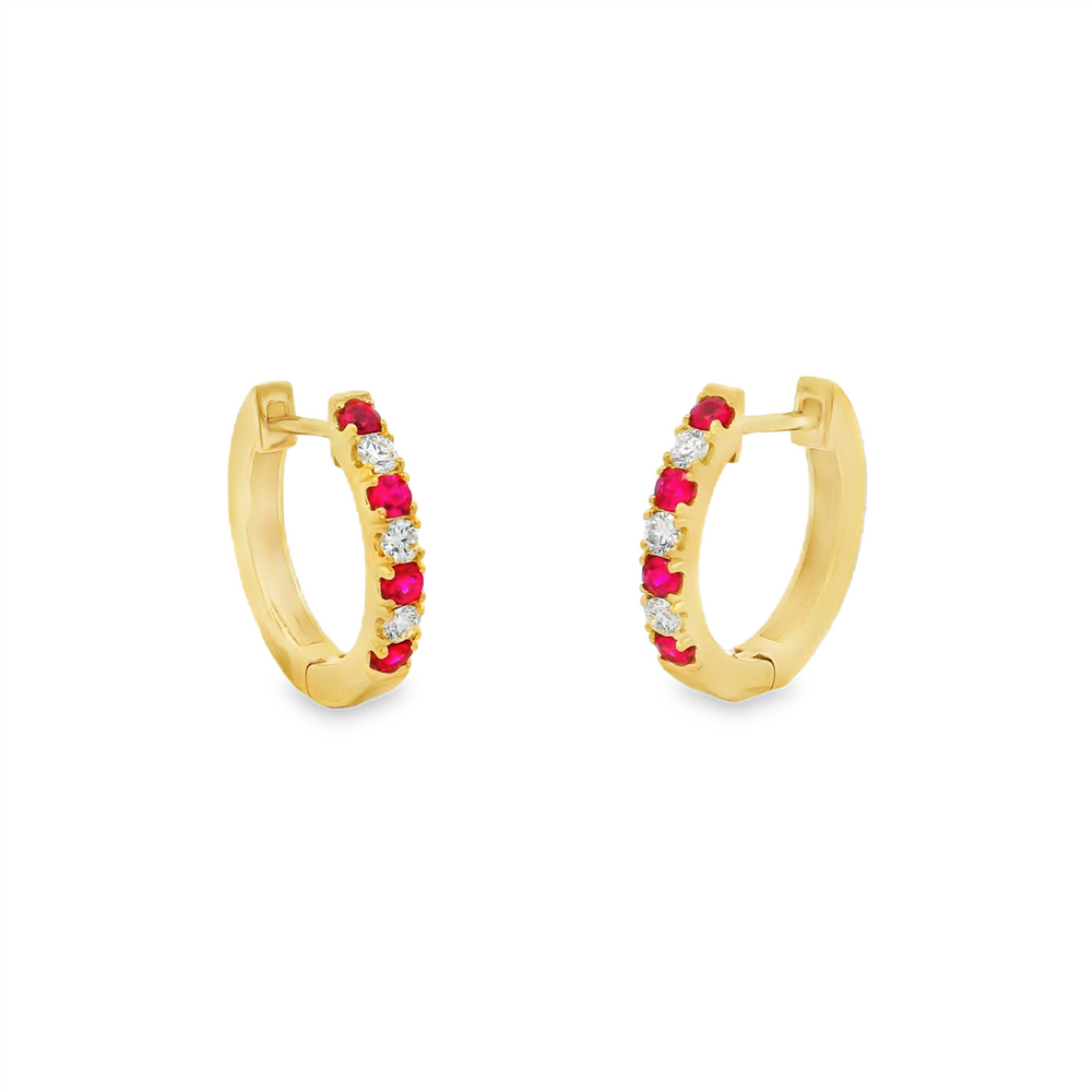 These 14K yellow gold hoop earrings feature 8 round rubies totaling approximately 0.32 carats, accented with 6 round brilliant cut natural diamonds totaling approximately 0.19 carats. Measuring 15.5 x 2.3mm and weighing 3.2 grams, these hoops offer a vibrant and elegant design, perfect for everyday wear or stacking with other favorites.