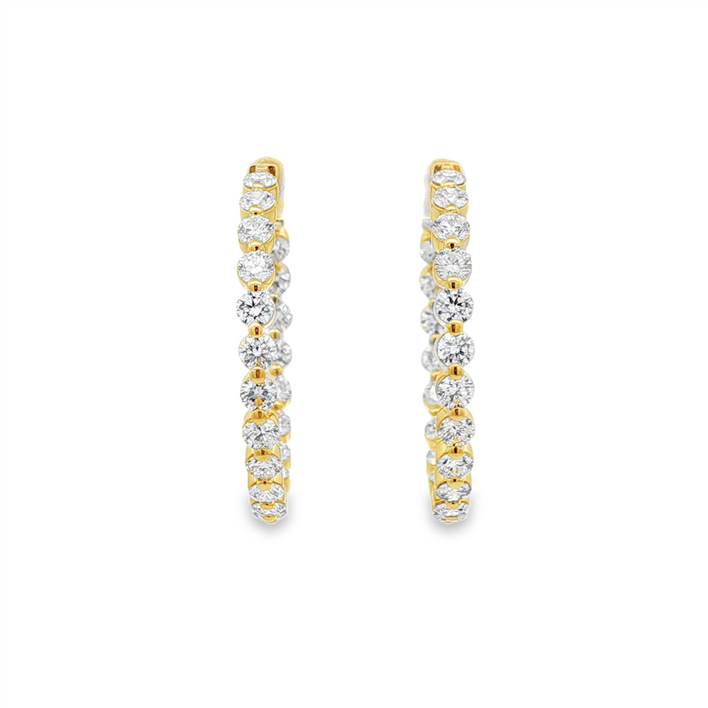 These 14K yellow gold hoop earrings feature a 34mm inside-out design, set with 42 lab grown round brilliant diamonds totaling approximately 5.57 carats. Designed to sparkle from every angle, they combine bold presence with timeless elegance—perfect for making a radiant statement.