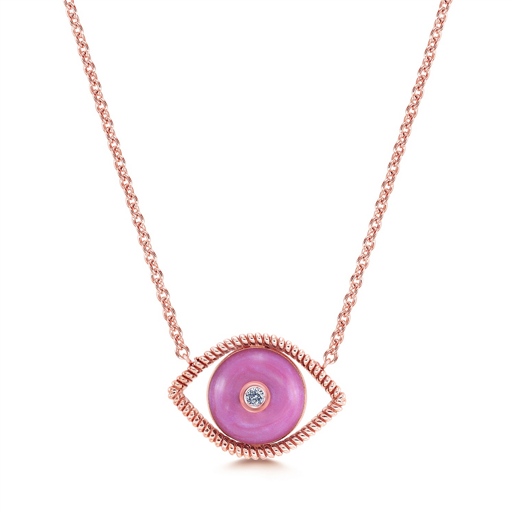 The 18KR Pink Enamel Evil Eye Necklace is a perfect blend of style, symbolism, and elegance. Crafted from luxurious 18K rose gold, this necklace features a captivating pink enamel evil eye pendant, a symbol known for its protective powers and positive energy. Accentuating the design are 0.03ctw GH/SI diamonds, adding a delicate sparkle that enhances the beauty of the piece. Ideal for both everyday wear and special occasions, this necklace combines the charm of timeless tradition with a touch of modern luxury. Whether for yourself or as a thoughtful gift, it’s a statement piece that brings both beauty and protection to any outfit.