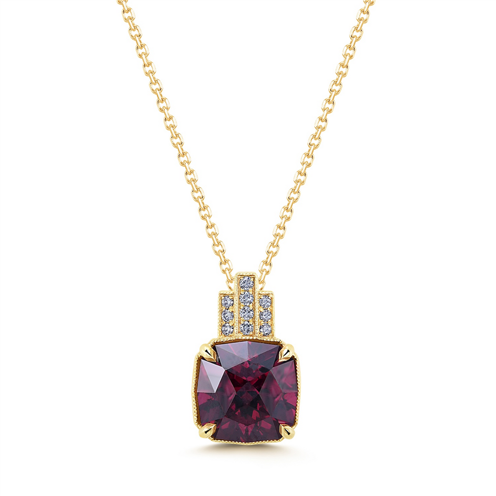 14K Yellow Gold Garnet Pendant with Diamonds – 4.90ct Cushion Rhodolite Garnet & 0.09ct Diamonds