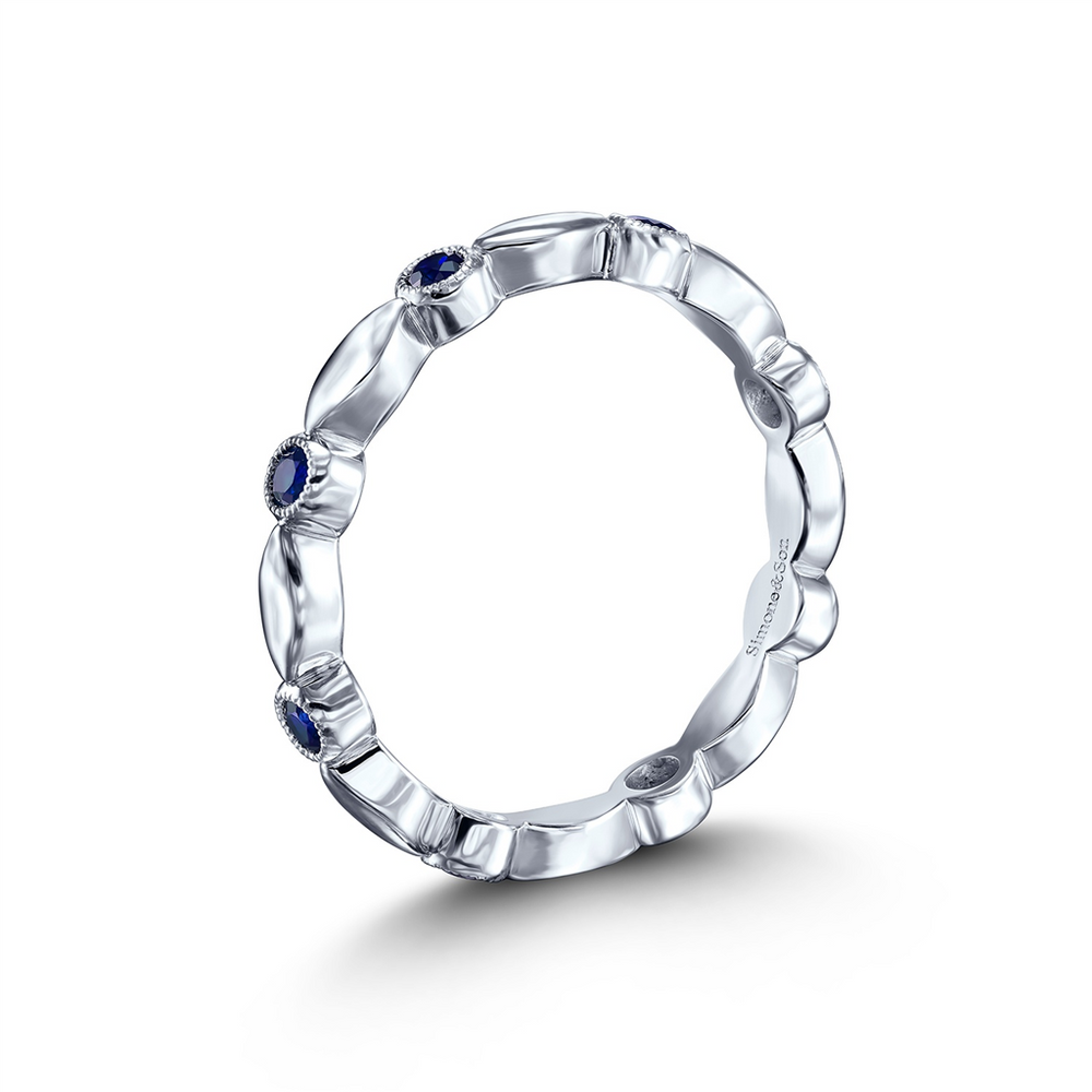 The bezel setting securely holds each sapphire in place, providing both durability and a modern aesthetic. The motif design of the band adds an artistic touch, with each sapphire placed in a repeating pattern that enhances the ring's visual appeal and creates a beautiful flow around the entire band.