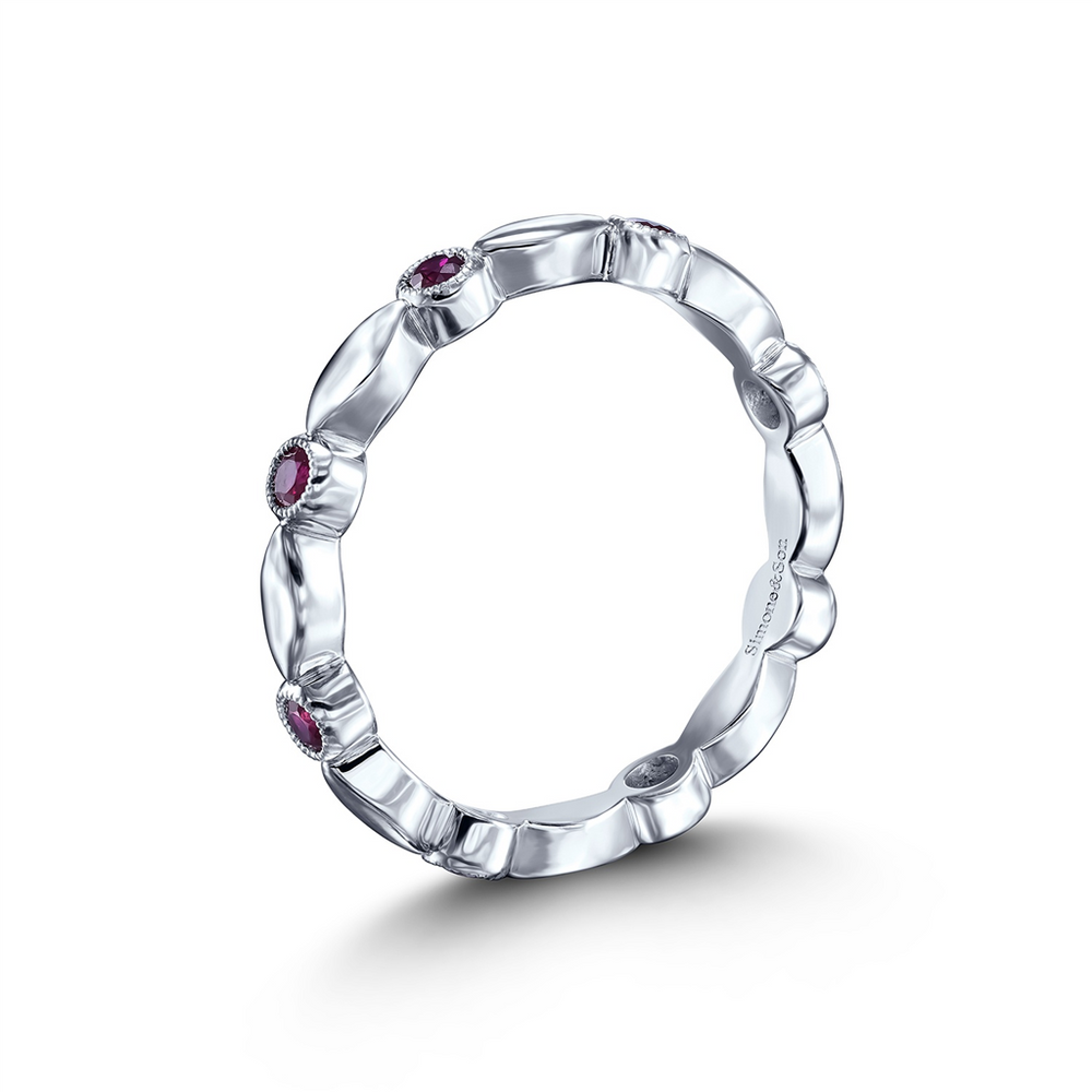 Each ruby is securely set in a bezel setting, which not only offers a sleek and modern aesthetic but also protects the gemstones. The motif design of the band, with its repeating pattern of rubies, creates a beautiful visual flow, adding a touch of artistic charm to the piece.