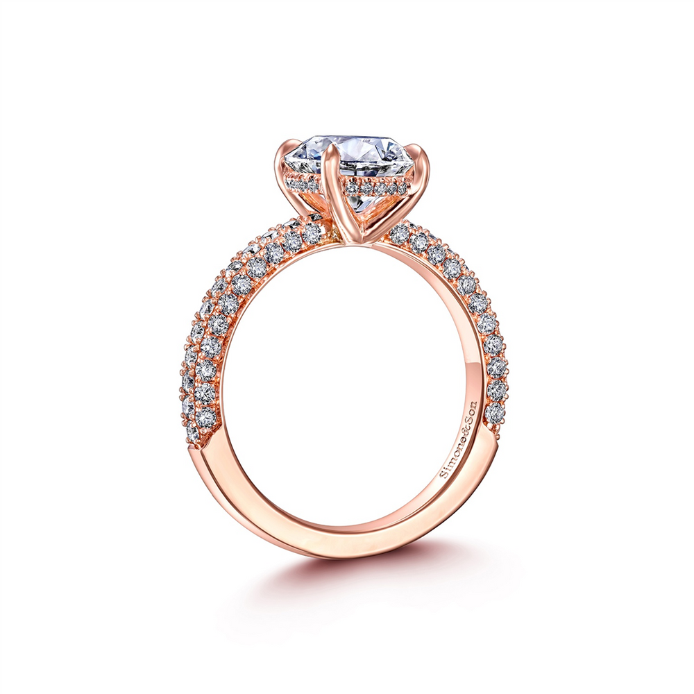 This exquisite 18K rose gold engagement ring features a stunning three-row pave design, beautifully set with perfect ideal cut natural diamonds. The diamonds, with VS clarity and GH color, adorn the shank and hidden halo, adding brilliant sparkle from every angle. With a total diamond weight of 0.77cts, this ring offers a timeless and sophisticated look, combining elegant craftsmanship with the brilliance of carefully selected diamonds.