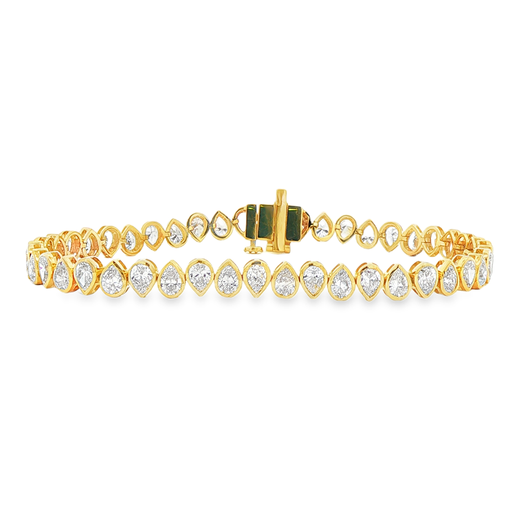 This 14K yellow gold tennis bracelet features elegant pear-shaped lab-grown diamonds set in sleek bezel settings for a modern, high-impact look. Measuring 7 inches in length and weighing 11.5 grams, the bracelet is set with 46 lab-grown pear diamonds totaling approximately 6.79 carats, creating continuous brilliance with a graceful, tapered silhouette. The warm glow of yellow gold beautifully frames each pear shape, while the bezel setting provides a smooth, secure profile that feels comfortable on the wrist. Striking on its own and stunning layered, this bezel-set pear diamond tennis bracelet is a standout statement piece and a refined addition to any fine jewelry collection.