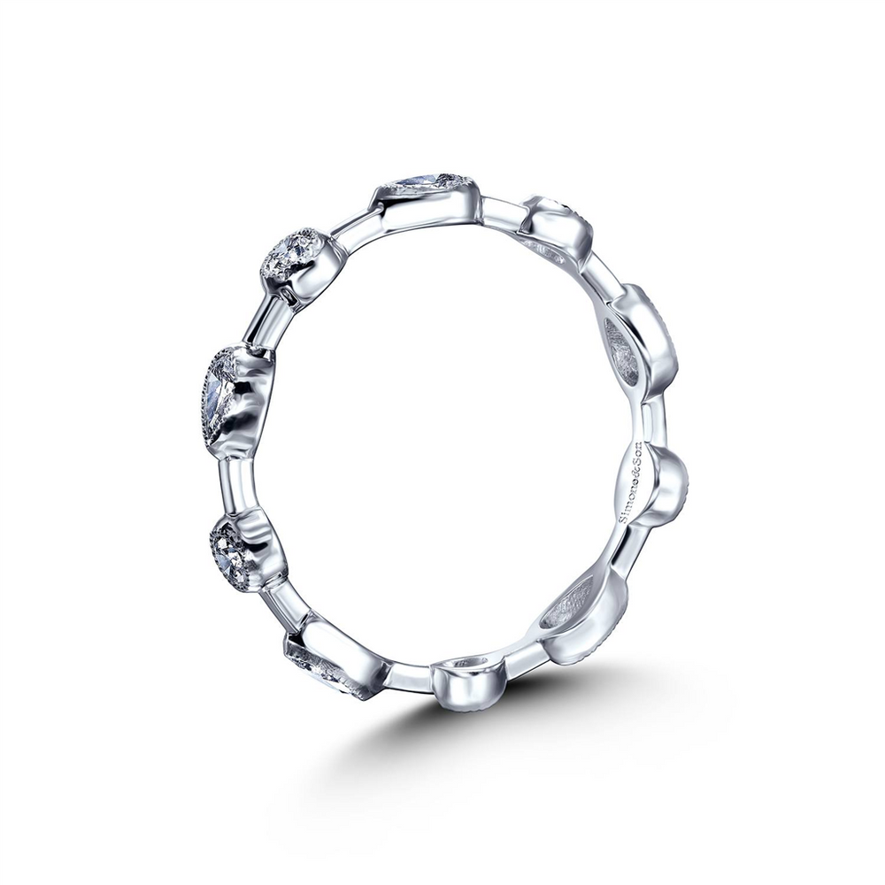 This stunning 14K white gold bezel band features a unique negative space design with bezel settings and a subtle millegrain finish. It is set with round and pear shaped diamonds, totaling approximately 0.55cts, with G color and VS clarity.