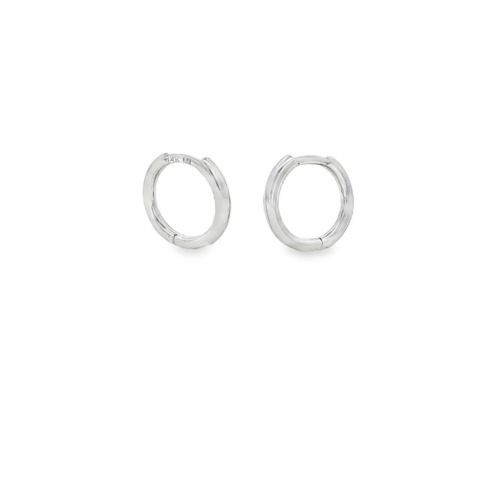 Crafted in 14K white gold, these huggie earrings measure 2mm thick by 8mm in diameter and weigh approximately 1.5g. Sleek and comfortable, perfect for everyday wear or layering with other earrings.