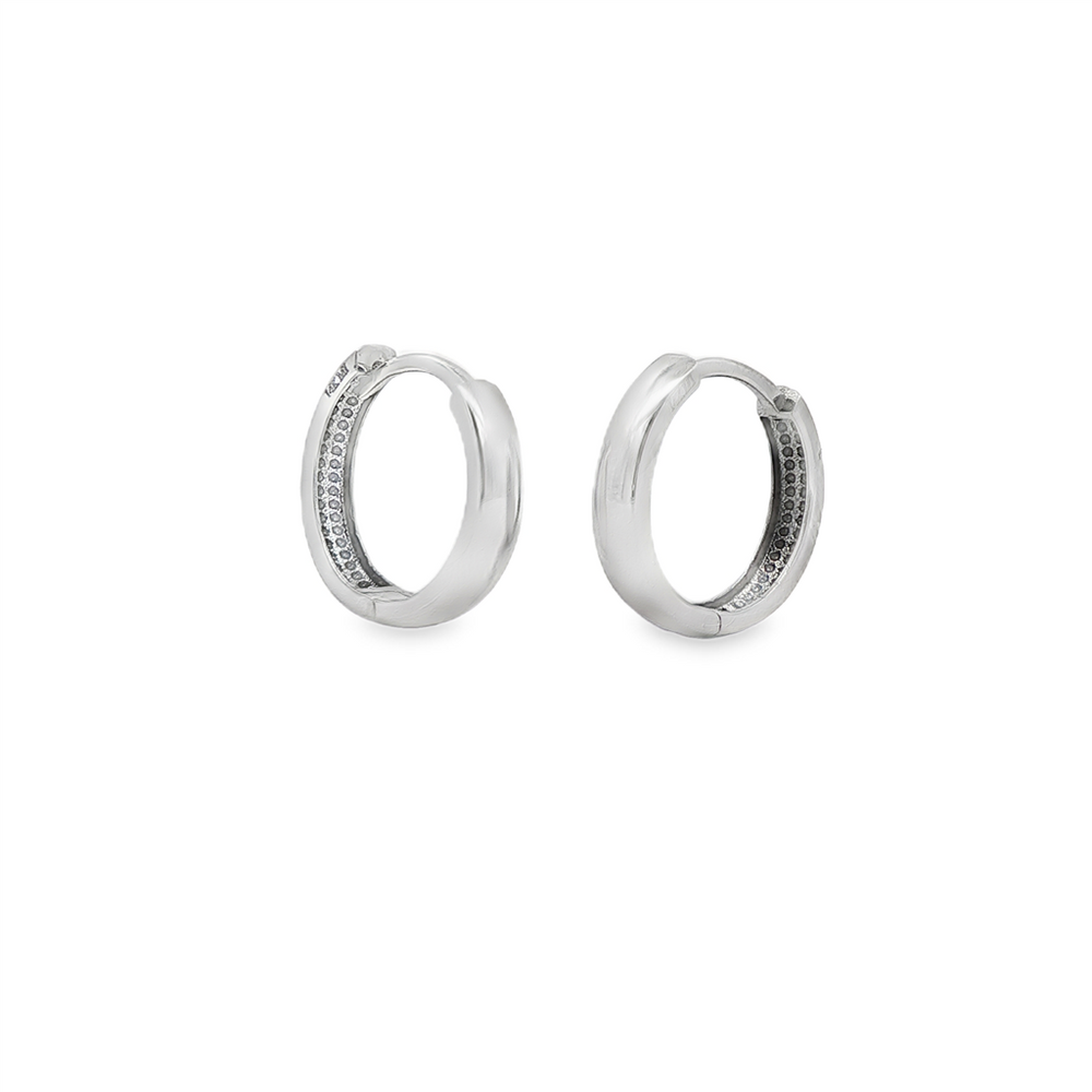 Crafted in 14K white gold, these huggie earrings measure 3mm thick by 12mm in diameter and weigh approximately 2g. Sleek and comfortable, perfect for everyday wear or layering with other earrings.