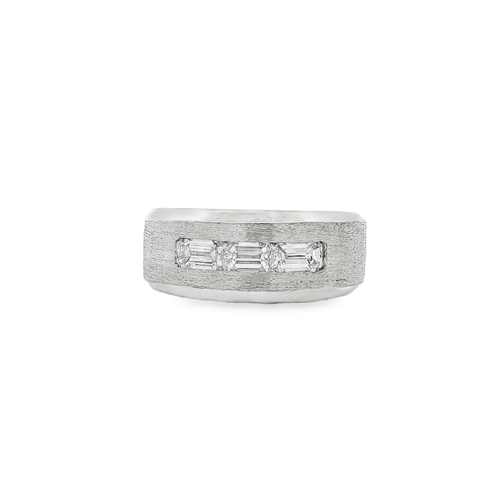 A striking estate men’s band in 14K white gold, featuring three natural emerald-cut diamonds with crisp, architectural lines. Each diamond is approximately 5 x 3 mm, totaling about ~0.96 CTW. Solidly made at 16.3g, this ring is an effortless statement—clean, masculine, and built to last.